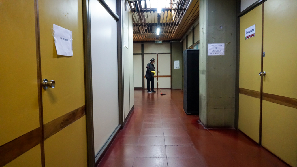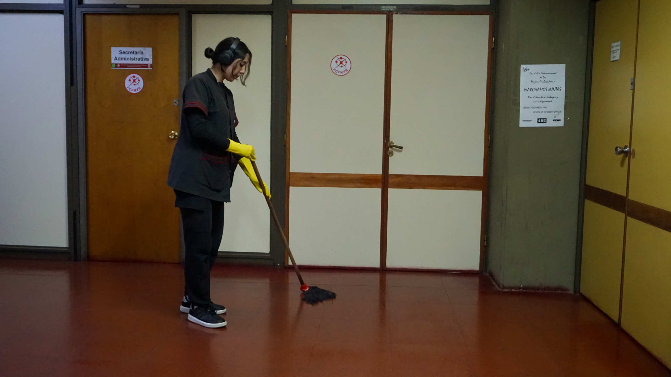 Con 24 años y apenas seis meses en la Facultad, Luz Vilchez integra el equipo de trabajo nodocente en tareas de mantenimiento y limpieza. Su entusiasmo y dedicación la han llevado a vincularse rápidamente con sus compañeros y con la comunidad universitaria.