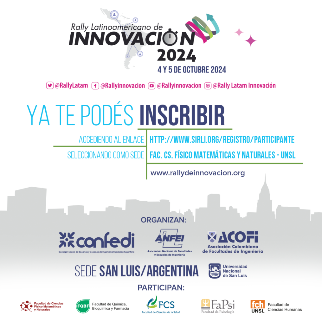 Este 4 y 5 de octubre de 2024, comienza una nueva edición del Rally Latinoamericano de Innovación. Una vez más, la UNSL será la sede para la Ciudad de San Luis y este año, la actividad es coorganizada por las Facultades de Ciencias Físico Matemáticas y Naturales; Química, Bioquímica y Farmacia; Salud; Psicología y Ciencias Humanas.