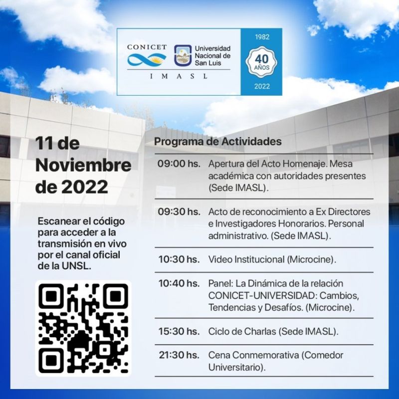 El Instituto de Matemática Aplicada San Luis (IMASL) de doble dependencia UNSL/Conicet festeja su 40 aniversario de creación. El acto de apertura se llevará a cabo el viernes 11 de noviembre, a las 9:00 horas.