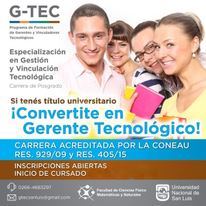 El 4 de septiembre iniciarán las clases en forma virtual para el cursado de la 6° cohorte de la carrera de posgrado: Especialización en Gestión y Vinculación Tecnológica (GTEC), en la Facultad de Ciencias Físico Matemáticas y Naturales de la Universidad Nacional de San Luis.