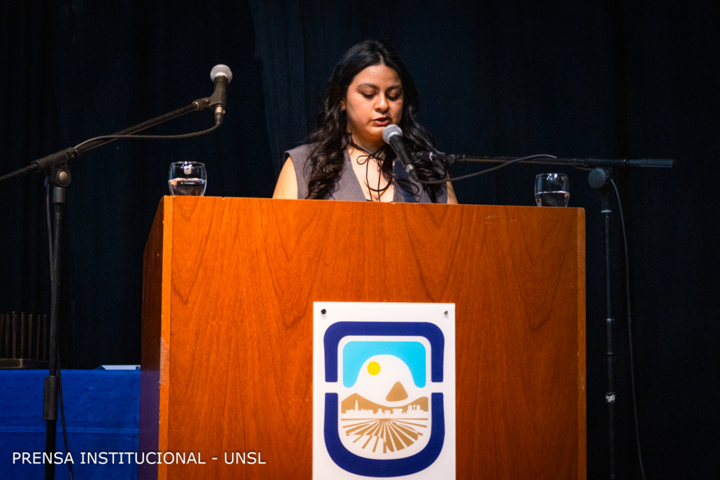 Fátima Comastri recibió su título de Licenciada en Cs. Geológicas y fue la encargada del discurso en nombre de los estudiantes “este es un buen momento para recordar que en nuestras manos tenemos la capacidad de influir y mejorar el mundo; la responsabilidad de utilizar nuestro conocimiento y habilidades no solo para alcanzar metas personales, sino también para contribuir al bienestar común, ya que la verdadera medida del éxito no solo se encuentra en los logros individuales, sino en el impacto positivo que podemos tener en la vida de otros. Por esta razón, motivo y convoco a mis pares egresados a asumir con valentía y compromiso activo la noble lucha en defensa de la educación pública, gratuita, laica y de calidad” expresó.