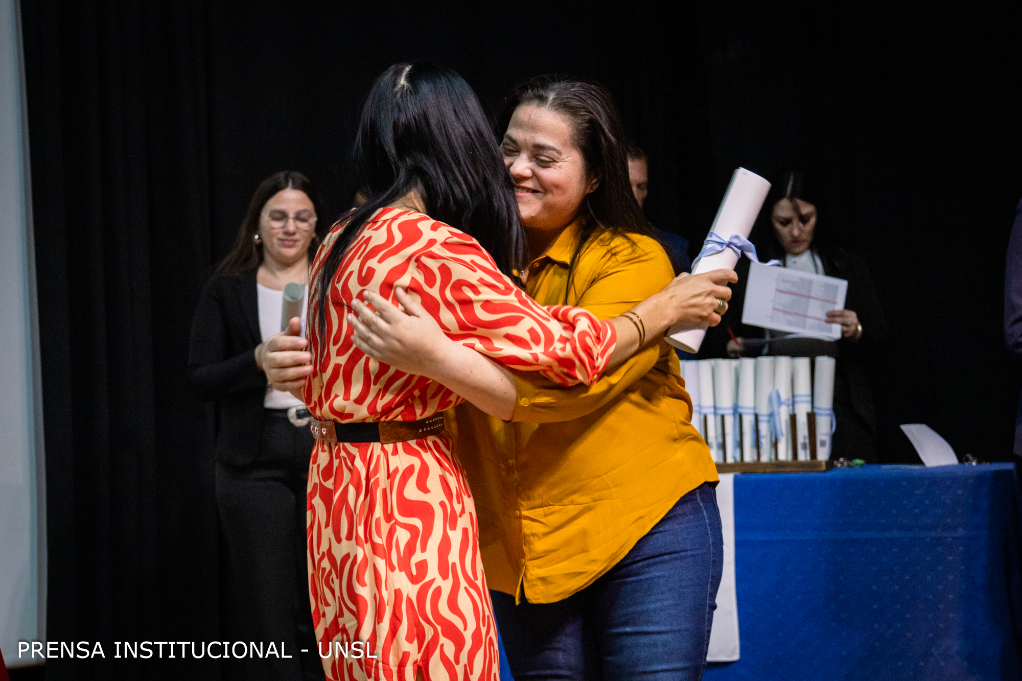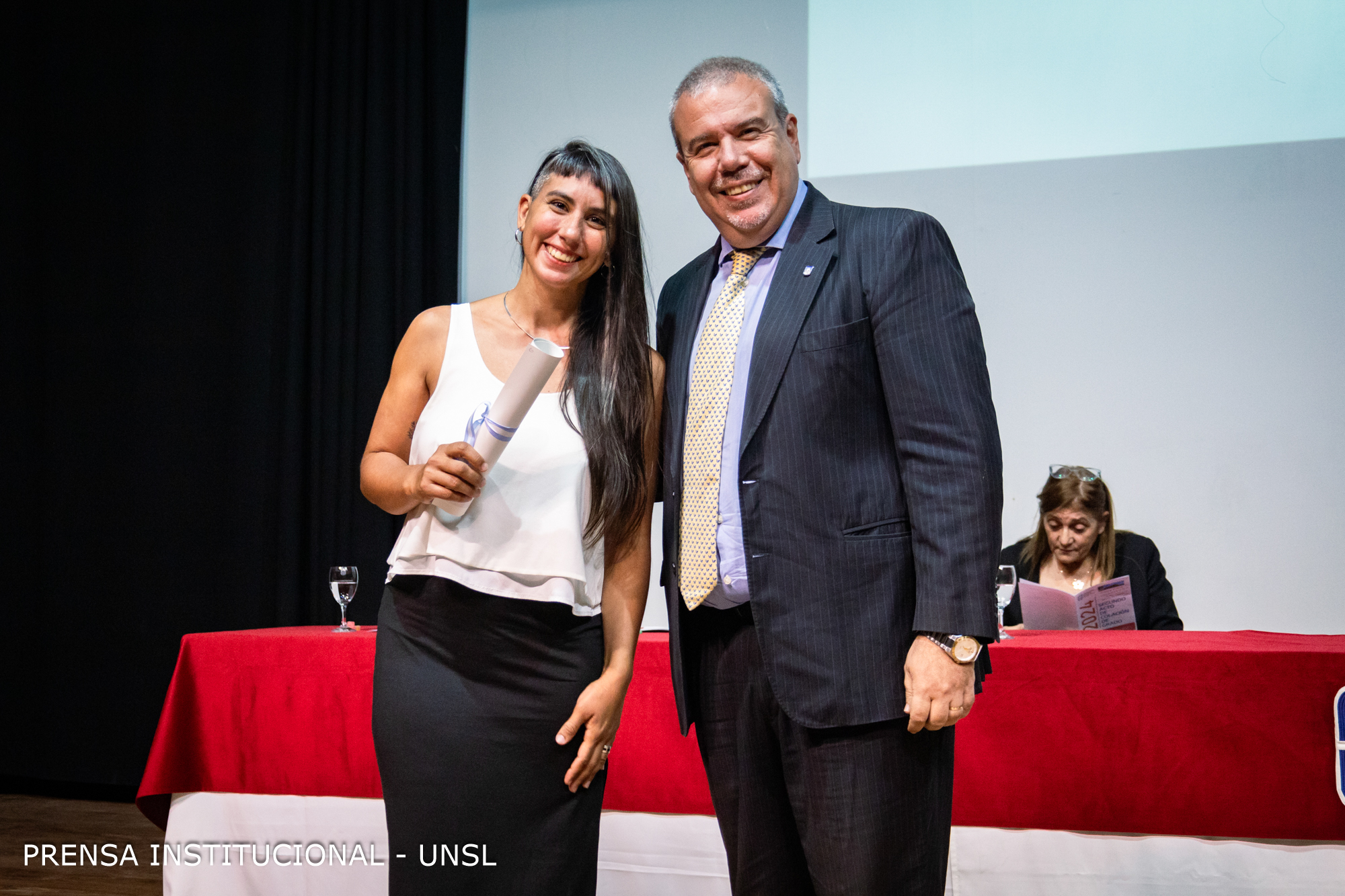 La Decana de la FCFMyN, Dra. Marcela Printista dedicó unas palabras a los/as graduados/as.Fátima Comastri, Licenciada em Cs. Geológicas, habló en nombre de los y las estudiantes.El rector de la UNSL, Víctor Moriñigo, dirigiendose a los/as egresados/as.